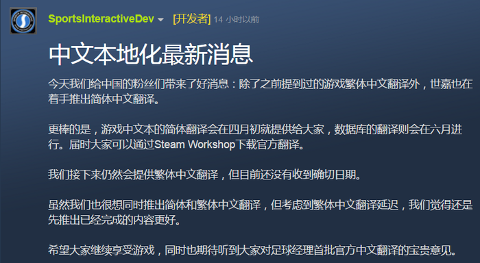 根据制作组Sports Interactive在Steam社区的公告,他们将在今年4月初推出游戏内文本的简体翻译,而数据库的翻译则将在6月份进行。需要中文翻译的玩家,可以通过Steam Workshop进行下载。