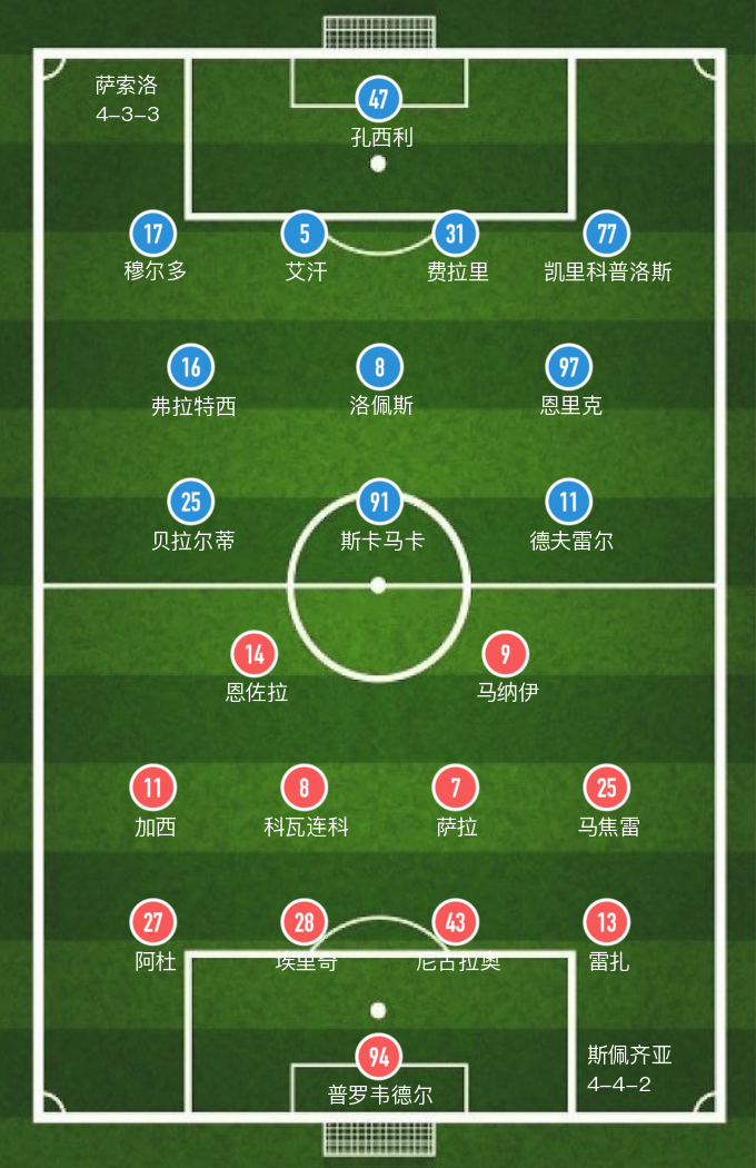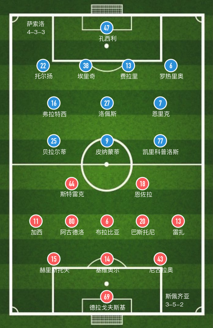 萨索洛(4-3-3): 47-孔西利,17-穆尔多(46' 22-托尔扬),5-艾汗,31-费拉里,77-凯里科普洛斯,16-弗拉特西(86' 20-哈鲁伊),8-洛佩斯,97-恩里克(46' 18-拉斯帕多里),25-贝拉尔蒂,91-斯卡马卡,11-德夫雷尔(69' 7-博加)