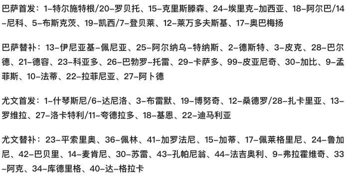 尤文图斯首发:1-什琴斯尼(46’36-佩林)、3-布雷默(59’24-鲁加尼)、6-达尼洛(61’43-孔帕尼翁)、12-桑德罗(61’17-卢卡-佩莱格里尼)、19-博努奇(46’15-加蒂)、13-罗维拉、27-洛卡特利(61’44-法乔利)、28-扎卡里亚、11-夸德拉多(78’42-巴尔别里)、19-小基恩(78’34-库德里格)、22-迪马利亚(78’30-马尔瓦诺)