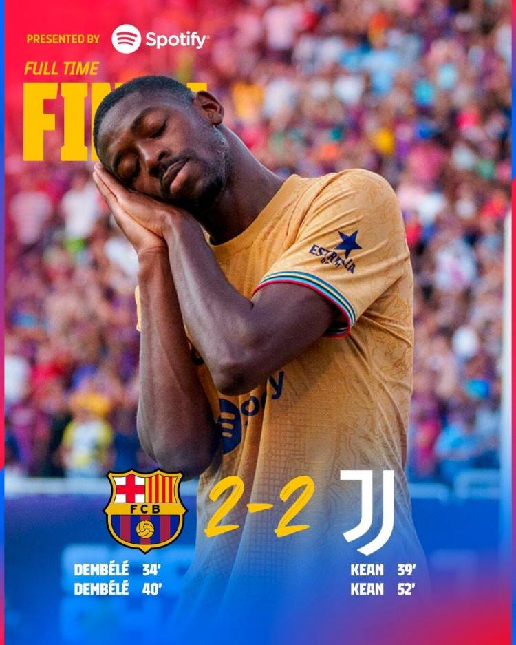 北京时间7月27日8点30分,巴萨美国行迎来一场焦点热身赛,对手是斑马军团尤文图斯,比赛在美国达拉斯棉花碗体育场进行。上半场比赛,登贝莱有如神助,连续两次上演连过数人破门好戏,帮助巴萨2-1暂时领先尤文;易边再战,小基恩推射完成梅开二度将比分扳平,拉菲尼亚、法蒂频频制造威胁,最终,巴萨2-2战平尤文,双方握手言和。