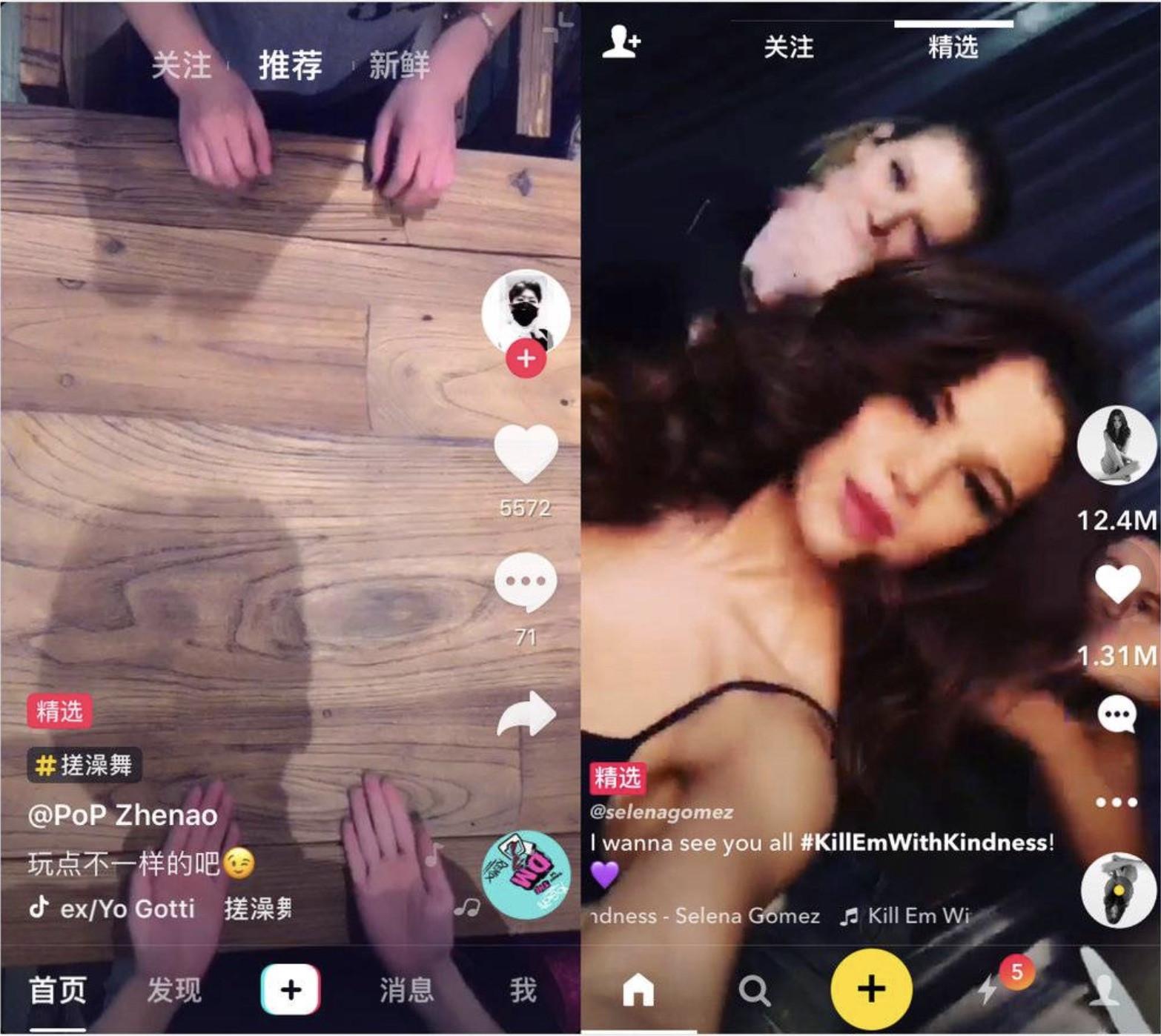在内容方面,抖音没有把音乐对嘴作为主要的玩法,而是增加了舞蹈派和创意派,扩大了潜在感兴趣的人群。在产品方面,由于深知中国年轻人重视自己所展现出的形象,抖音为此投入很多资源在滤镜和特效上,让用户不需要化妆就可以自信地进行创作。(左为抖音界面,右为musical.ly界面)