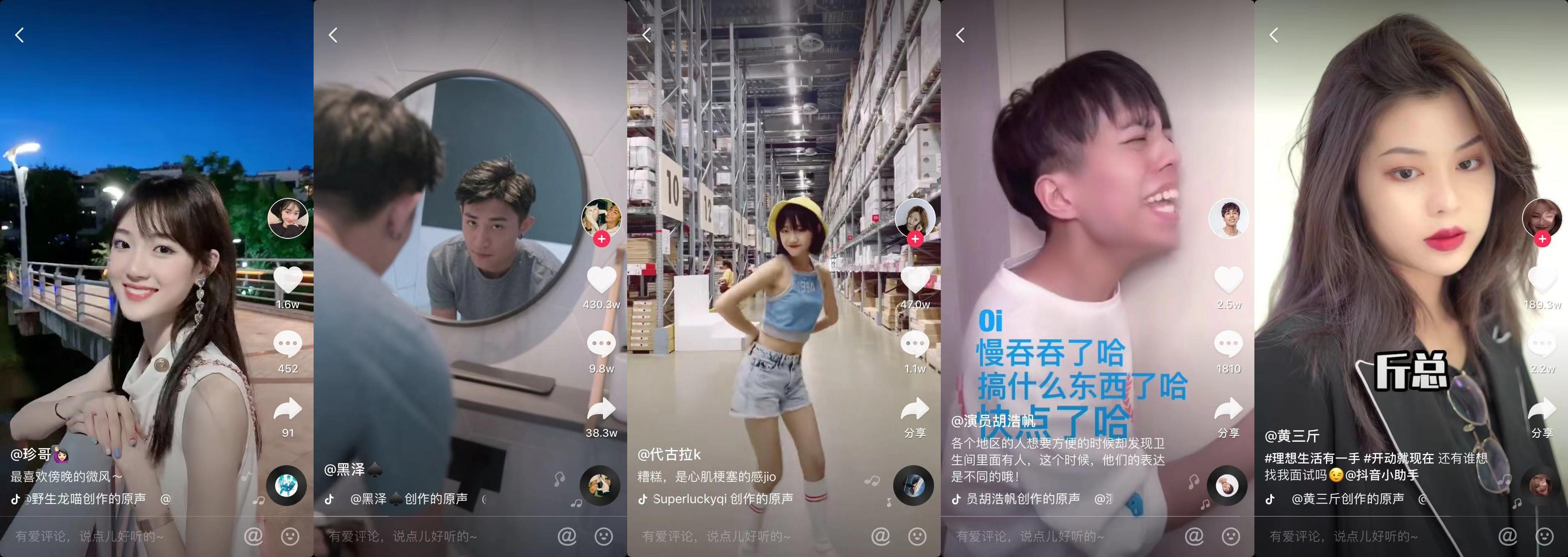 如今运用各种花式运镜技巧的技术流因为门槛较高已经越来越少见,话题挑战也没再专门运营,但用户开始自发引领潮流,每天都有新的手势舞、新的特效玩法、新的拍摄主题涌现。用户用相同的视频原声或相同的特效,既能进行跟随模仿,也能创作多元内容。因此,抖音良好的UGC氛围来源于早期官方的引导和现如今用户的自发创造,大量内容的趣味性和其模仿跟随的低门槛使得用户在产品内的参与感始终很强。
