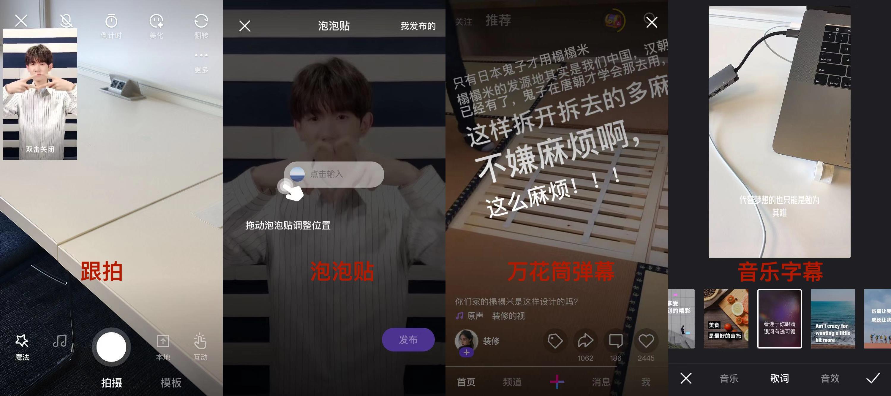 撇开内容不说,抖音和微视在观看视频、评论、点赞、创作视频等核心功能上的体验基本一致。为了和抖音显得不同,微视开创出以下特色功能:跟拍、泡泡贴、万花筒弹幕、歌词字幕、互动视频。