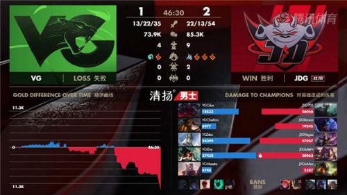 JDG众人复活后想要追击VG撤退的大部队,结果在野区再次遭到了VG的反击,剑魔大灭进场砍翻后排,VG又击杀三人,顺势一波结束了比赛,取得1:0暂时领先。