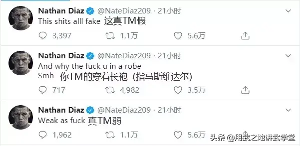 正当全世界的武粉都沉浸在嘴炮王者归来的喜悦之中时,许多拳手也对嘴炮的本场比赛发表了看法。“拖鞋”本·阿斯科伦则是力挺嘴炮 VS 马斯维达尔,争夺UFC第一狠人金腰带。而嘴炮的好基友“小麻”迪亚兹,却连发三条动态,条条口吐芬芳,直言真TM弱,真TM假,对嘴炮的这场比赛发表了质疑。此外,也有部分中国武粉对牛仔这场比赛的表现不太满意。