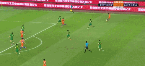 国安禁区内疑似手球,鲁能球员向裁判请求观看var,裁判确认手球。佩莱助跑一蹴而就。