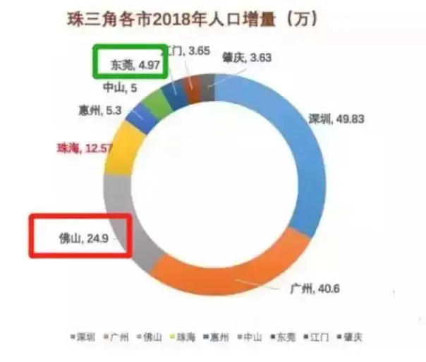 人口吸引力方面,据广东省统计局数据显示,2018年佛山市新增常住人口达到24.9万人,广东省内排名第三,创下近8年新高,而东莞新增常住人口仅4.97万人。