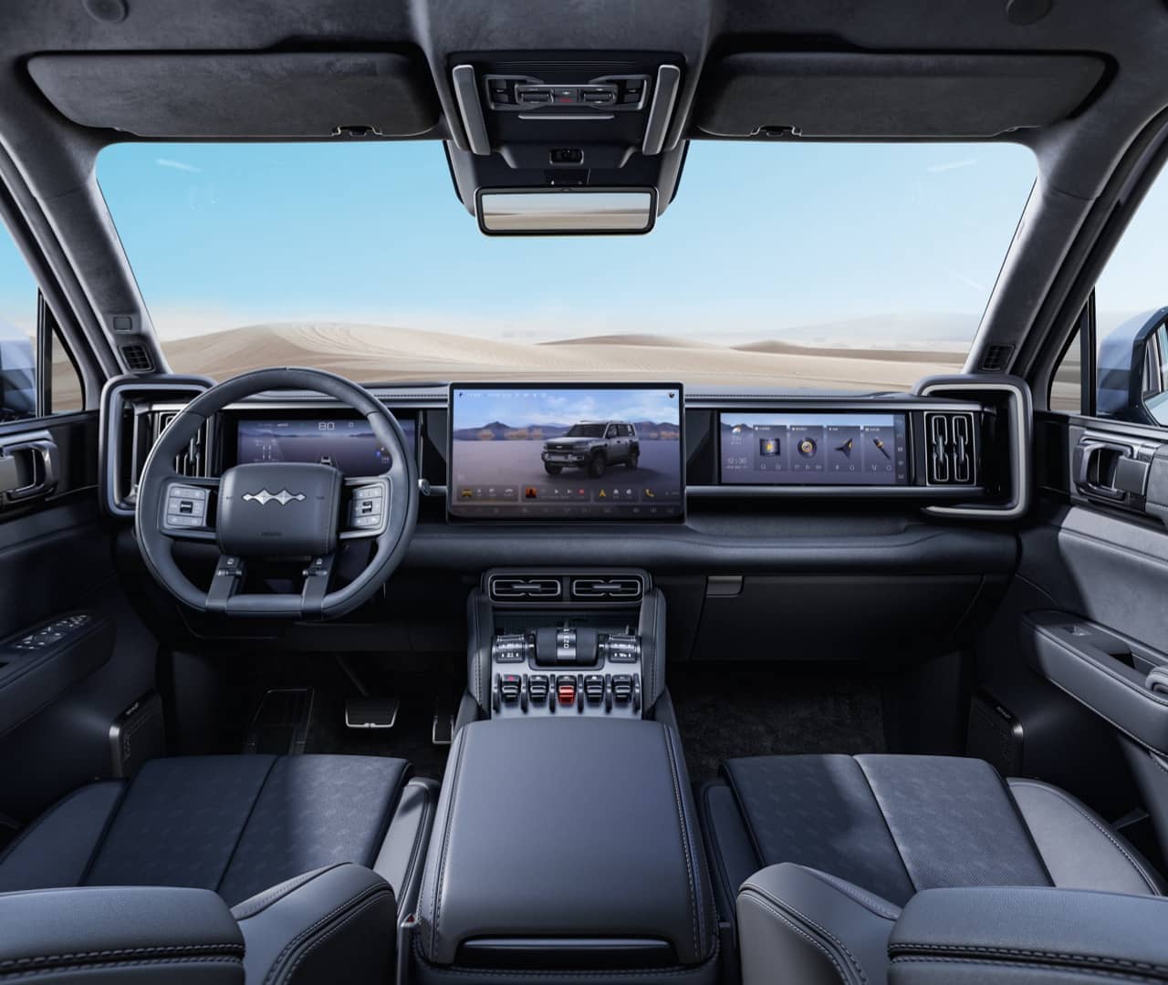 方程豹 5 采用了前后双叉臂式独立悬架,在越野驾驶中,其非承载式车身结构、较高的离地间隙、以及优秀的接近角和离去角设计,使得车辆在面对复杂多变的越野路况时能够游刃有余。然而,由于是插电混动车型,在进行越野时可能会担心磕碰到电池,且维修起来相对麻烦。