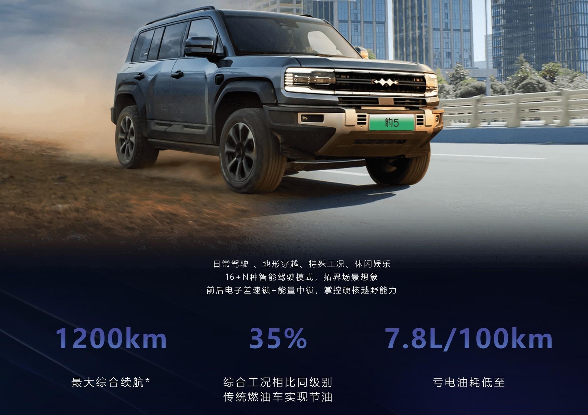 方程豹 5 搭载的是 1.5T 插混系统,并配备前后双电机,系统综合最大功率达到了 505 千瓦,最大扭矩高达 760 牛·米,百公里加速只需 4.8s,动力表现强劲。纯电续航里程可以达到 125 公里,满油满电的情况下,综合续航更是可以飙到 1200km。