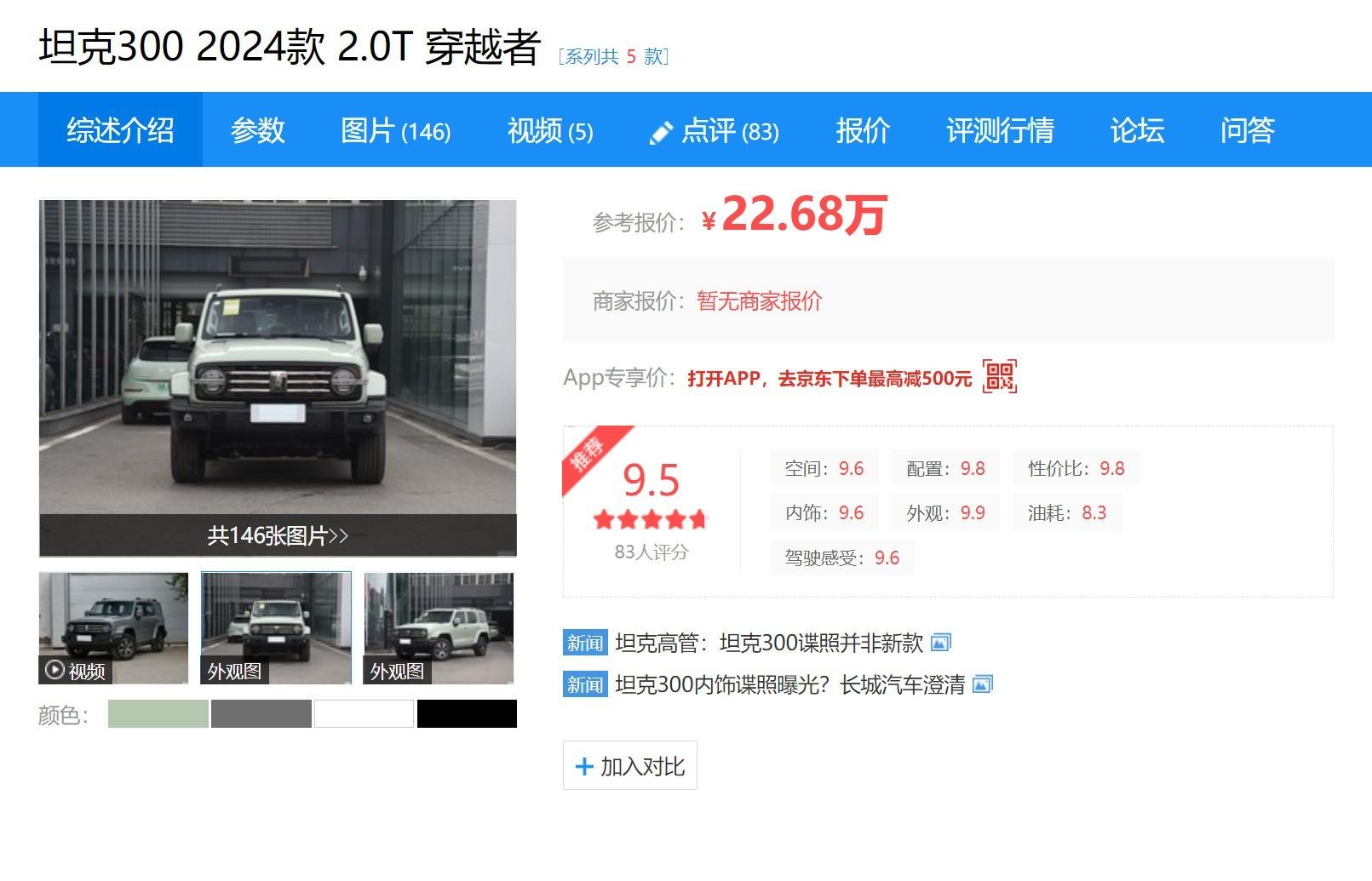 坦克 300 中与方程豹 5 探索版处于相似价位的车型是穿越者,指导价为 22.68 万元,但需要交购置税,同样加上车船税、交强险、商业险、上牌费之后,最终的落地价在 25.4 万左右,要比方程豹 5 探索版更贵一些。