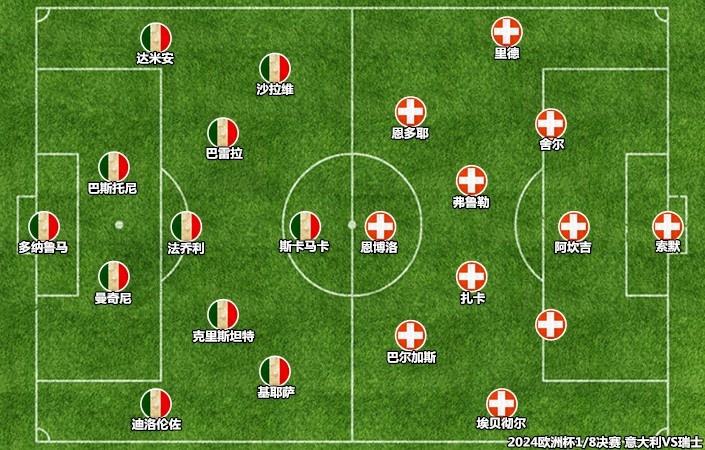 斯帕莱蒂不敢冒险使用年轻的贝拉诺瓦,却让长期在俱乐部踢不上球的法乔利坐镇中路要津;扎卡尼已经从绝杀克罗地亚的过程中建立了信心,本场获得首发资格的却是此前出场机会寥寥的沙拉维;迪洛伦佐和达米安分居两闸,巴斯托尼来到左中卫位置,巴雷拉却依然要在逆足位置上痛苦挣扎。瑞士以跑动和对抗能力出众著称,斯帕莱蒂希望双前锋组合能够分兵支援身后的队友,斯卡马卡的短板恰恰就是无球移动,坐在替补席上的拉斯帕多里和雷特吉更适合首发出场消耗对手。