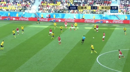 正当所有人以为比赛将走向加时赛甚至是点球大战时,瑞典队的福斯贝里彻底打破了沉闷的僵局。比赛66分钟,福斯贝里在禁区前沿横向带球,随后起脚远射,瑞士队的阿坎吉伸腿一挡,足球突然变线,门将佐默只能目送足球入网。