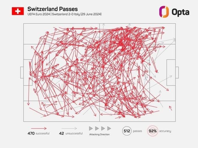 数据统计显示,瑞士在本场512次传球、470次成功,成功率高达92%,创造队史在大赛阶段的新纪录。曼奇尼时代的意大利以出色的传控夺得欧洲杯,如今的表现令人大失所望,巴尔加斯的进球便源于意大利后卫送出的球权。
