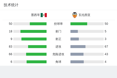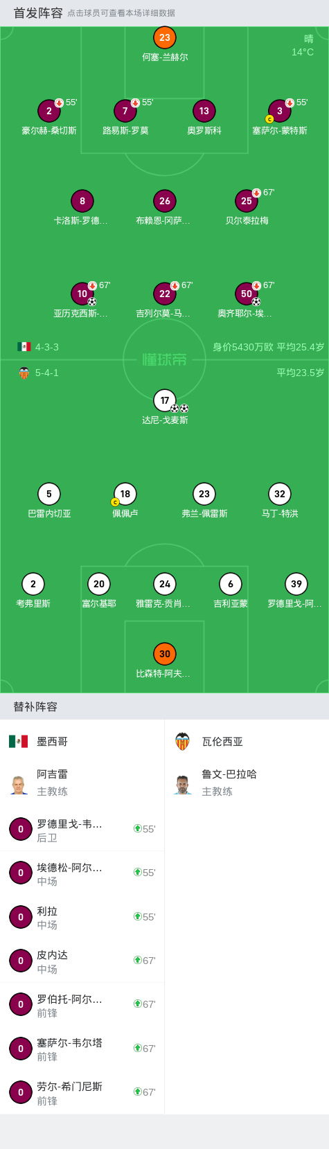 北京时间10月13日国家队友谊赛,墨西哥对阵瓦伦西亚。墨西哥亚历克西斯-维加破门,奥齐耶尔-埃雷拉破门。瓦伦西亚达尼-戈麦斯梅开二度。最终比分墨西哥 2-2 瓦伦西亚。