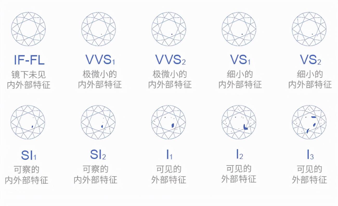 GIA净度分级系统有11个净度等级,依次为FL,IF、VVS1、VVS2、VS1、VS2、SI1、SI2.I1.I2.I3.
