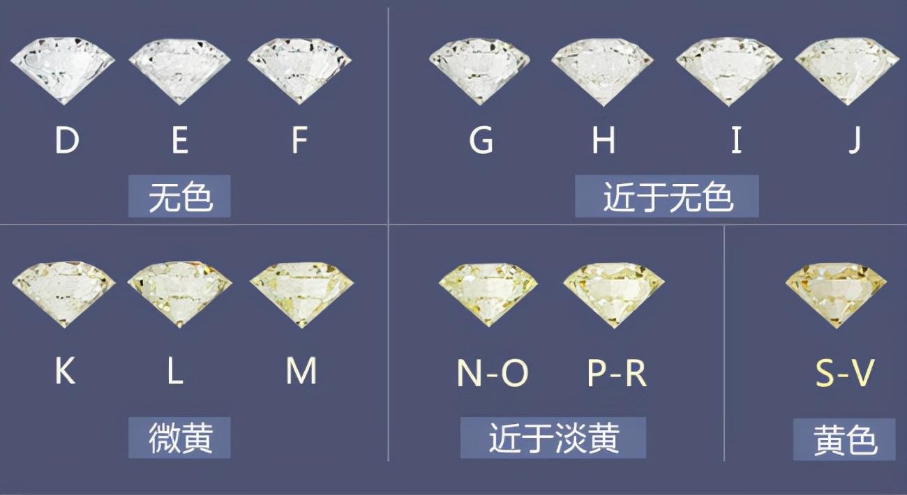 钻石的颜色什么色最好呢?钻石的颜色级别GIA把无色到浅黄色或浅褐色系列钻石颜色变化划分为23个连续的颜色级别,由高到低用英文字母D、E、F、G、H、1、J、K、L、M、N、O、Q、R、S、T、U、V、W、X Y、Z代表不同的色级。