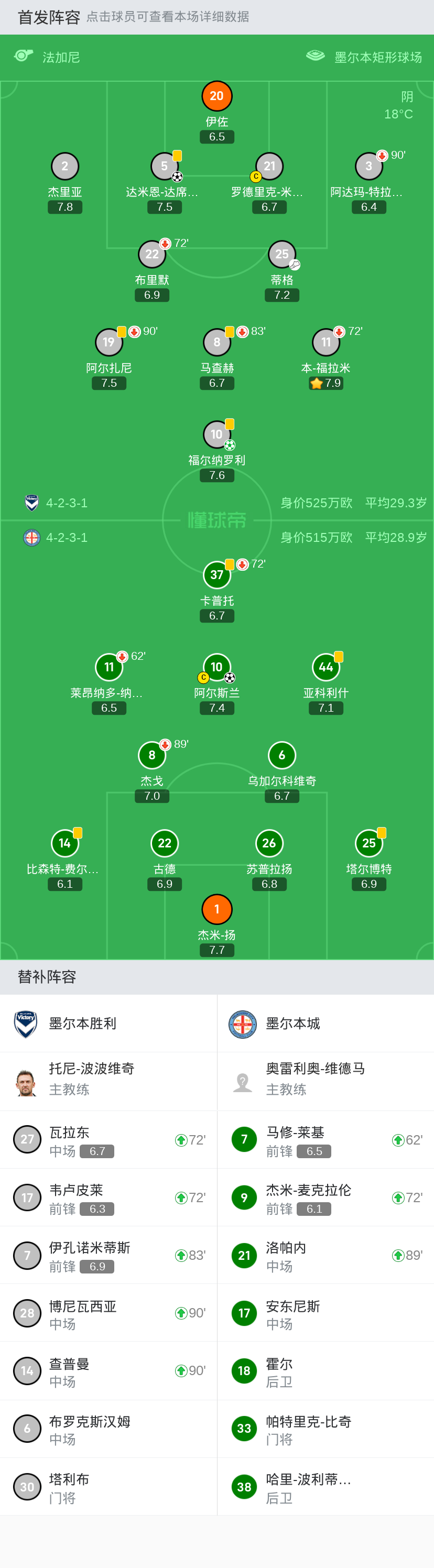 墨尔本城 首发:26-苏普拉扬, 1-杰米-扬, 10-阿尔斯兰, 8-杰戈, 22-古德, 44-亚科利什, 6-乌加尔科维奇, 11-莱昂纳多-纳特尔, 14-比森特-费尔南德斯, 25-塔尔博特, 37-卡普托