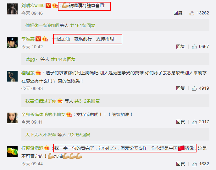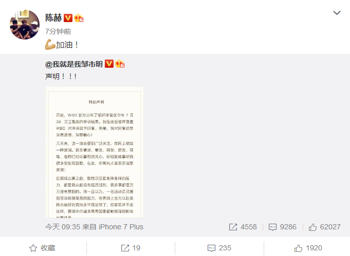 随后陈赫也转发微博!为皱市明加油。网友更是表示:“败给对手不丢人,再接再厉把失去的再赢回来呗,这才证明自己行,输了后玩命找各种理由,盲目指责,说自己行不该输,有什么说服力呢?胜不骄败不馁,希望你别让这次失败阻碍了你前进的步伐”。希望皱市明能够战胜自己。