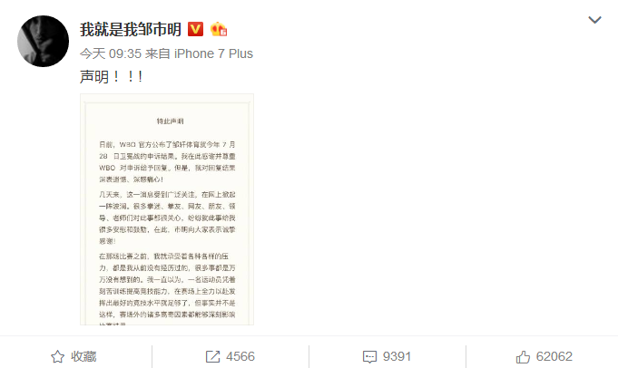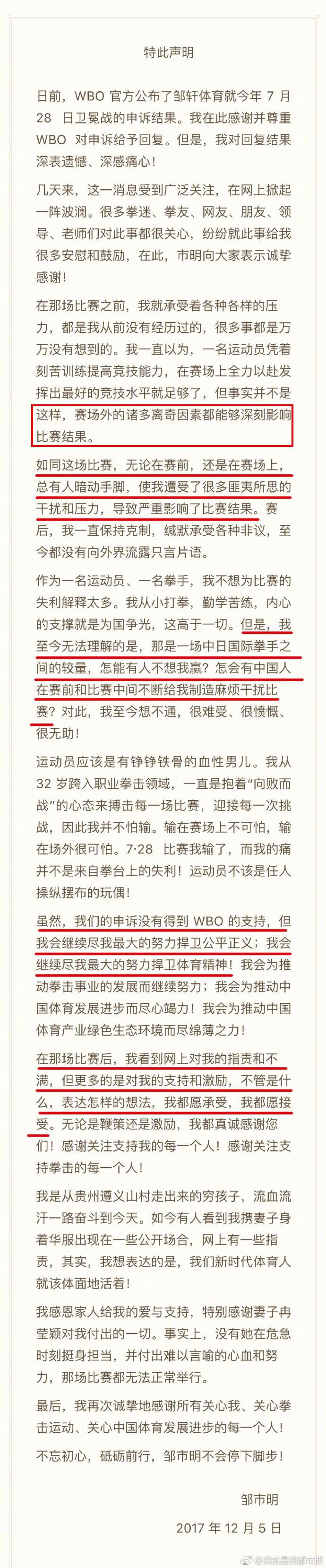 自从今年7月份皱市明不敌日本选手木村翔,因此遭到许多来自国人,来自网络的一些键盘手的攻击和嘲讽;其实,输掉了比赛最痛苦的无疑是皱市明本人。在比赛中皱市对于WBO的判定其实是存在不公平的,因此对WBO进行申诉。但是,经过两轮申诉和上诉后,WBO上诉委员会维持原判。让皱市明倍感无耐特发此声明: