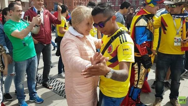 哥伦比亚球迷算是传统的南美人,性格奔放,几百人成群在红场空旷地带跳舞,声势盛大,偶尔遇到几个墨西哥球迷和巴西球迷,哥伦比亚人也能和他们小范围一起互动。