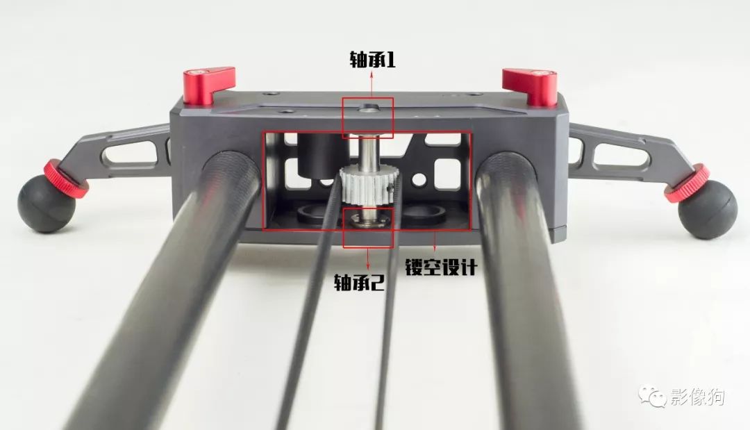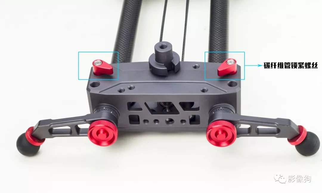 顶部两颗红色螺丝是碳纤维管锁紧螺丝,上面有提到烈龙滑轨采用的是模块化设计,所以可以在有需要时随意卸下螺丝,拆装加长, 各个部件在日常保养维护自己就可轻松搞定非常方便。