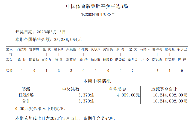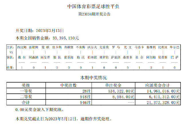 北京时间3月13日,胜负彩第23034期开奖结果揭晓。本期一等奖开出28注,单注奖金53.4万元。二等奖开出918注,单注奖金6984元。任九开出3378注,每注奖金4809元。本期胜负彩销量为33,395,130元,任九投注总额25,386,954元。