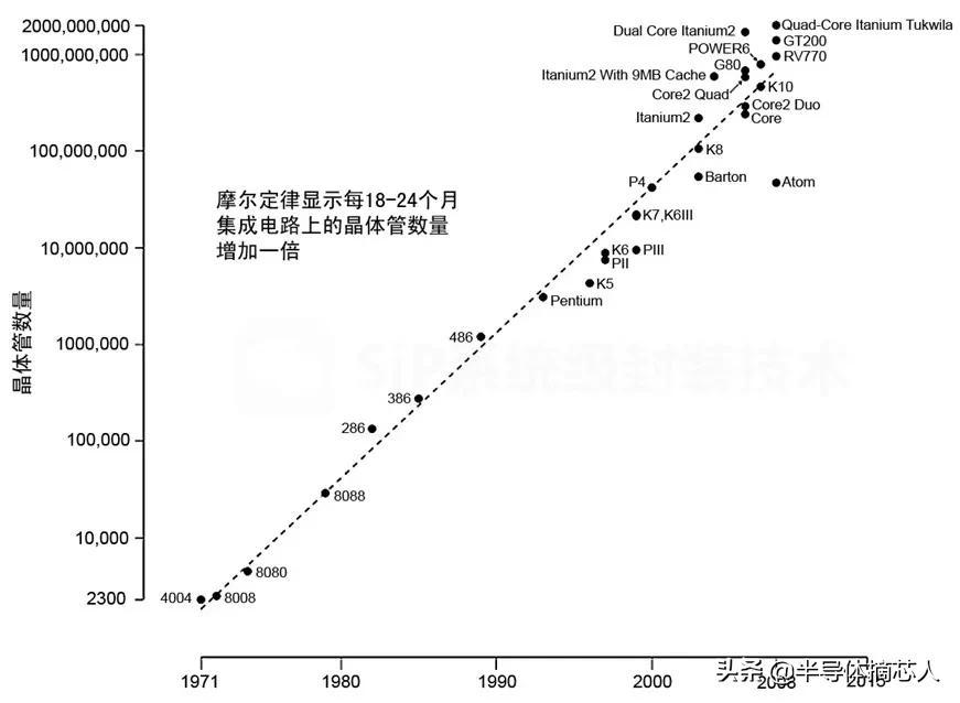摩尔定律到底准不准?让我们先来看下面一张图,从图中可以看出,采样点基本位于曲线的附近,可以看出摩尔定律基本上还是准确的。