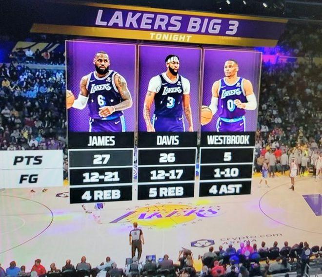 安东尼·戴维斯得到28分和17个篮板,马利克·蒙克发挥神勇,得到29分。拉塞尔·威斯布鲁克只打了29分钟,10投1中得到5分4篮板6助攻,还有4失误,效率值全队最低,加时赛还被弃用。常规时间结束时,转播中心打出湖人三巨头的数据,威少只有5分非常“辣眼睛”。