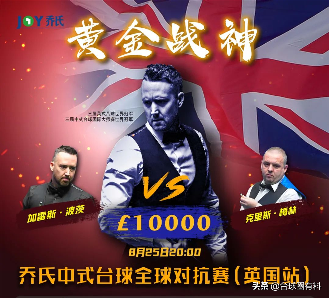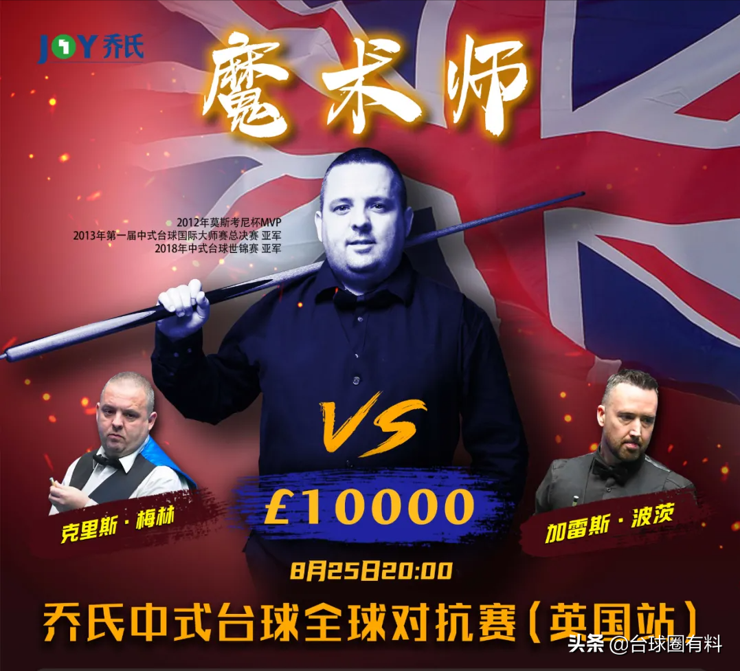 8月25日晚20:00,乔氏中式台球对抗赛第三站(英国站),双星交汇,竞技之外,还有情怀。此时此刻,巅峰对决已临近,狂欢的号角已吹响,你准备好了吗?“黄金战神”加雷斯·波茨VS“魔术师”克里斯·梅林,我们不见不散!!