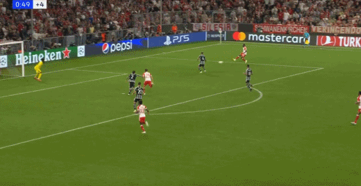 第32分钟,穆西亚拉杀入禁区回传,格纳布里无人盯防扫射破门,拜仁2-0!