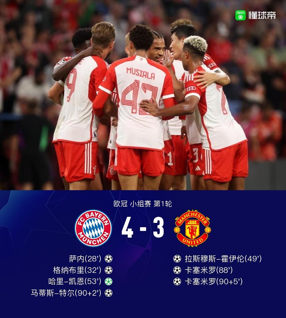 北京时间9月21日03:00,欧冠小组赛A组第1轮迎来一场焦点大战,拜仁慕尼黑坐镇主场慕尼黑安联球场迎战曼联,本场主裁判为格伦-尼贝里。上半场,埃里克森开场失良机,随后凯恩助攻萨内首开记录,穆西亚拉助攻格纳布里扫射再下一城,奥纳纳扑救失误。下半场,霍伊伦斩获红魔首球,凯恩点射建功,卡塞米罗头顶脚踢上演梅开二度,特尔替补建功。最终,拜仁主场4-3击败曼联。