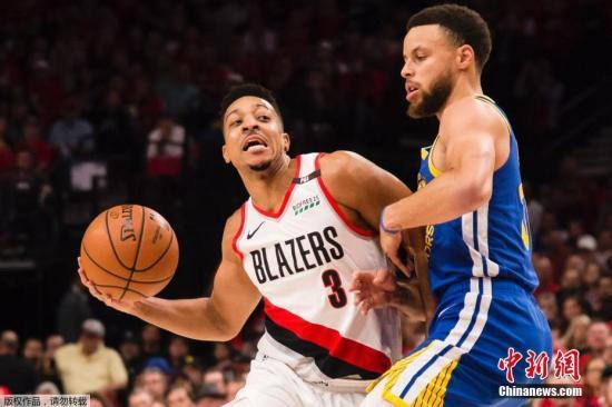 当地时间5月20日,NBA西部决赛第四场,勇士通过加时赛以两分的优势119:117战胜开拓者,4-0横扫对手晋级总决赛。图为开拓者球员麦科勒姆上篮。
