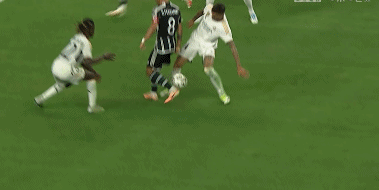 第33分钟,贝林厄姆在禁区内尝试1V4突破。尽管,皇马小巨星的盘带和过人非常出色,但还是难过利桑德罗-马丁内斯这关。