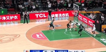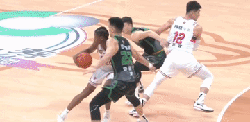 面对右侧中线附近被夹击,他冷静摘球,王岚嵚利用李晓旭掩护轰进三分。