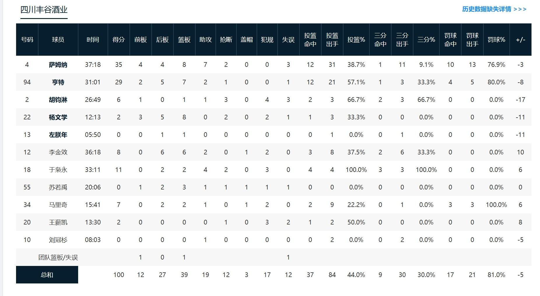 四川队:萨姆纳35分8篮板7助攻2抢断,亨特29分7篮板,李金效8分6篮板,于枭永11分,马里奇7分,胡钧淋6分。