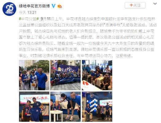 中新网9月11日电 据上海绿地申花官方微博消息,申花中场钱杰给在今天上午前往养老院参加了一项爱心活动,并自费购买了礼物赠送给养老院的老人们。