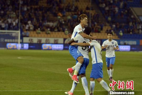 天津亿利队队员庆祝进球。 蔡志坚 摄