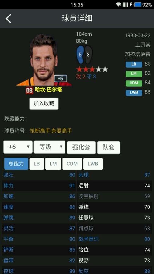 第一个推荐的就是我的主力LB,08E哈坎巴尔塔, 184的身高,不慢的速度,简直就是14W罗霍和14W阿拉巴的结合体,能攻能守,还能客串打后腰,推荐+6以上,6卡5000万,5卡1500万,这样的全能LB哪里去找?