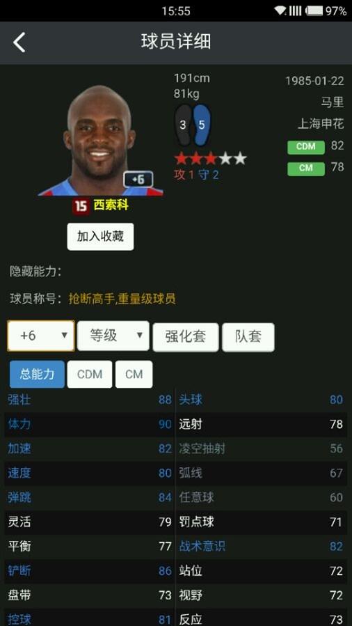 第二个推荐的就是我大申花西索科 !你一定以为我是推荐CDM的吧,错了,我是来推荐CB的,+6的西索科1级CDM能力是82,CB的能力居然打到了84!191CM,81KG的模型单抗盖子毫无压力,双速上80,盯人抢断上85,这么优秀的数据还这么便宜,5卡1500万,6卡5000万,是我上分后防中坚,你们值得拥有,推荐6卡以上
