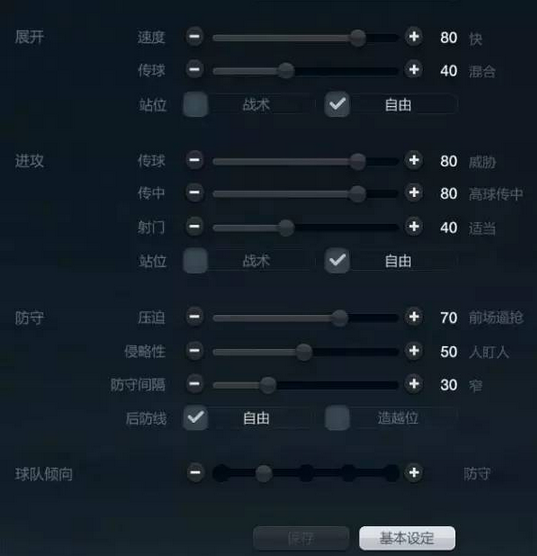 打法:进攻时应快速通过前场,交给边路发起进攻。然后等待中前卫的插上,组织阵地战。