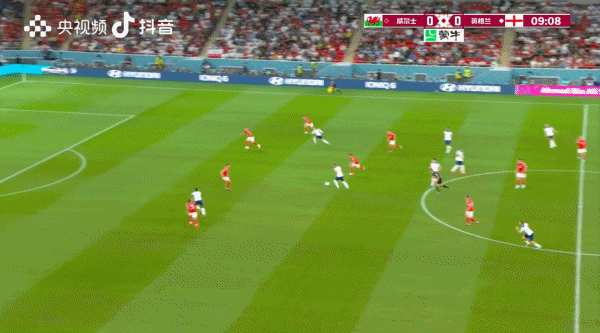 但威尔士队的逼抢只有几分钟的时间出了效果,随后就被英格兰队接管比赛,牢牢占据了控球权。这是因为威尔士队的逼抢缺少强度,没有给英格兰队后场出球带来太大压力,同时威尔士队又担心前场抢的太猛,自己本方半场又会给英格兰队太多空间,因此英格兰队一旦突破摩尔和詹姆斯的逼抢线后,威尔士队的中场线马上就会退守了。
