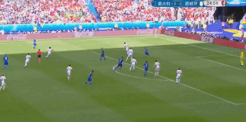 第62分钟,意大利再次反击,埃德尔右路带球内切,到了前场中路禁区前沿低平球给到左侧,左路的德西利奥弧线球传中,西班牙禁区内一片混乱,最后球被解围了。