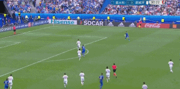第32分钟,佩莱禁区前拿球转身,被身后的拉莫斯放倒。意大利获得禁区前位置极佳的任意球。埃德尔一脚大力任意球,打穿了人墙就被德赫亚扑出,贾凯里尼抢射被德赫亚放倒,基耶利尼在皮克身前抢先一脚,把球打进。意大利1-0领先卫冕冠军西班牙!