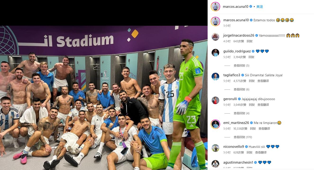 直播吧12月14日讯 在以3-0的比分完胜克罗地亚后,阿根廷顺利闯进了卡塔尔世界杯决赛。赛后,阿根廷人不仅在球场上进行了庆祝,和以往一样,他们回到更衣室再次进行了庆祝。不过,门将埃米利亚诺-马丁内斯当时并不在场。