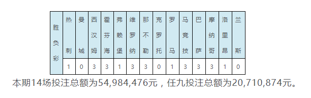 北京时间9月28日,胜负彩第20039期结束了全部14场的争夺。焦点战中,曼城主场2-5不敌莱切城,造9倍大冷;拜仁客场1-4不敌霍芬海姆,造10倍大冷。英超赛场,热刺主场1-1冷平纽卡斯尔,造4.71倍冷门,西汉姆主场4-0狼队;弗赖堡1-1战平沃尔夫斯堡。意甲赛场,维罗纳1-0小胜乌迪内斯,那不勒斯6-0大胜,AC米兰客场2-0完胜,罗马2-2尤文。西甲赛场,马竞和巴萨均在主场大胜对手。法甲赛场,摩洛哥3-2斯特拉斯堡,洛里昂1-1里昂,巴黎客场2-0完胜兰斯。