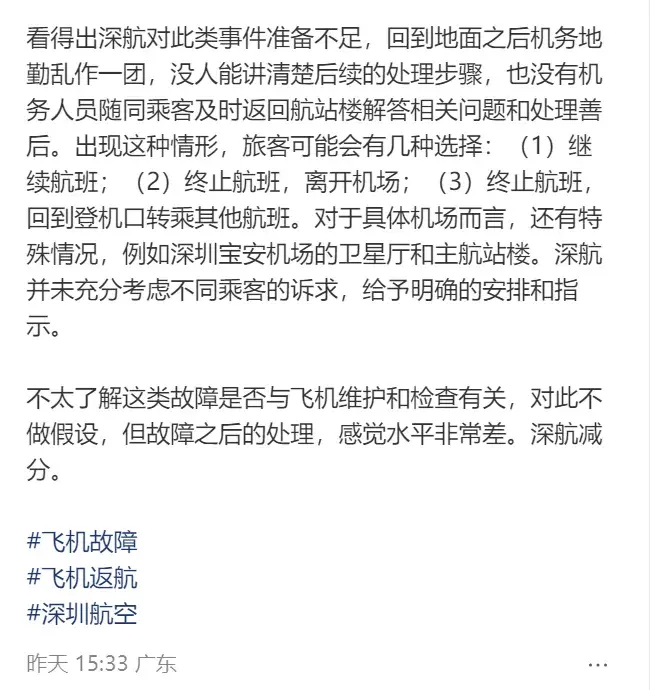 该名网友称,深航ZH9105航班起飞20分钟后“因增压系统故障返航”,并称回到地面之后,没人能讲清楚后续的处理步骤,也没有机务人员随同乘客及时返回航站楼解答相关问题和处理善后。