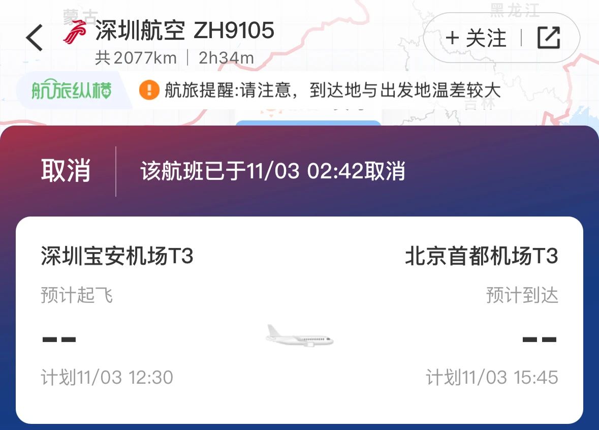11月3日从深圳飞往北京的ZH9105航班已取消。
