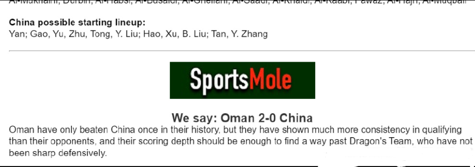 很显然外界看不看好实力处于下风,同时积分上也落后的中国队,外媒《SportsMole》进行预测,称虽然阿曼队的历史上只击败过中国队1次,但本届12强赛阿曼队的表现更加出色、稳定,而且坐镇主场,他们的进攻可以找到中国队防守的漏洞。外媒的预测是中国队0-2不敌阿曼队。