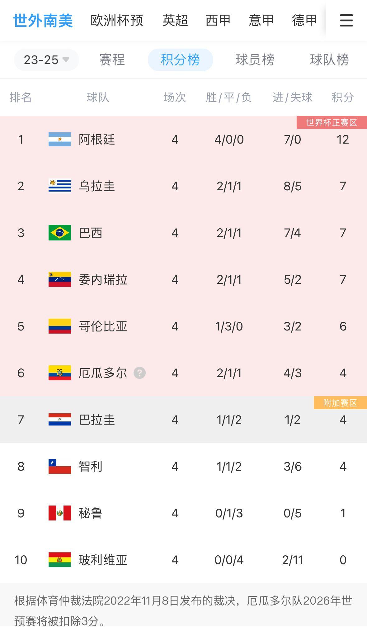 目前南美世预赛4轮过后,阿根廷4连胜0失球高居第一,乌拉圭4战2胜1平1负排在第二。