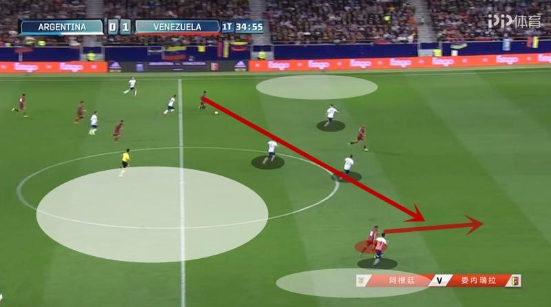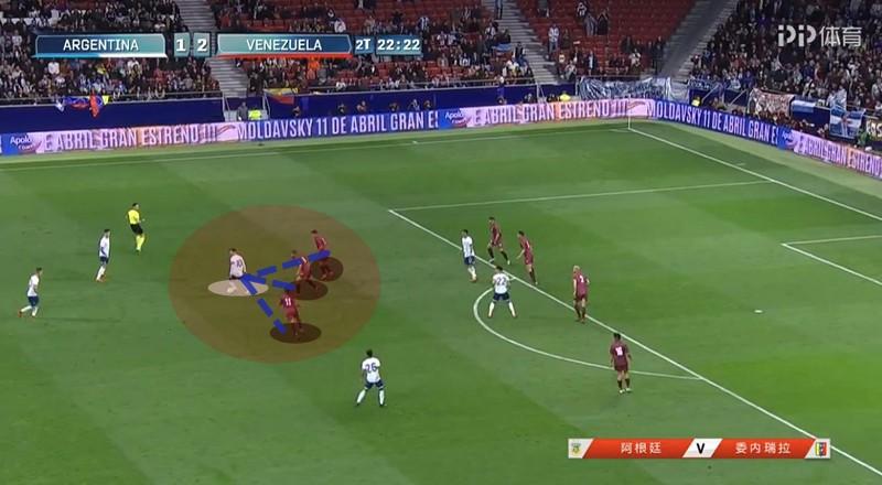 由于阿根廷缺乏支柱型中锋,加上球队喜欢层层中路推进的技战术风格,使得委内瑞选择了中路人员堆积防守的策略。虽然阿根廷下半场比赛取得进球,但从整体来看这个战术相当奏效。身高只有174cm的劳塔罗-马丁内斯作为阿根廷中锋,更多的时候只能依靠脚下球来解决问题,但由于对方在中路的密集防守,导致他无法在禁区内舒服拿球。而委内瑞拉在禁区前沿建立的屏障,也使得阿根廷难以进入禁区。